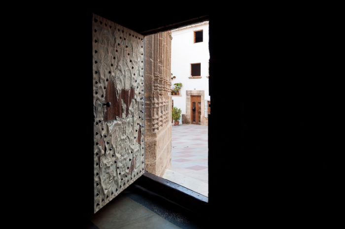 Gastada de recibir la llamada Puerta principal de la iglesia de San Bartolomé en Xàbia, Alicante. Agosto de 2016.
